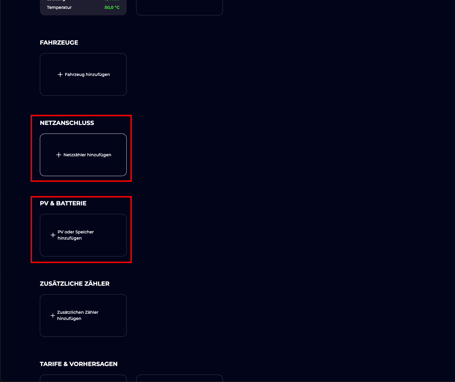 Scrolle im Konfigurationsbereich zum Abschnitt NETZANSCHLUSS und klicke auf + Netzzähler hinzufügen.