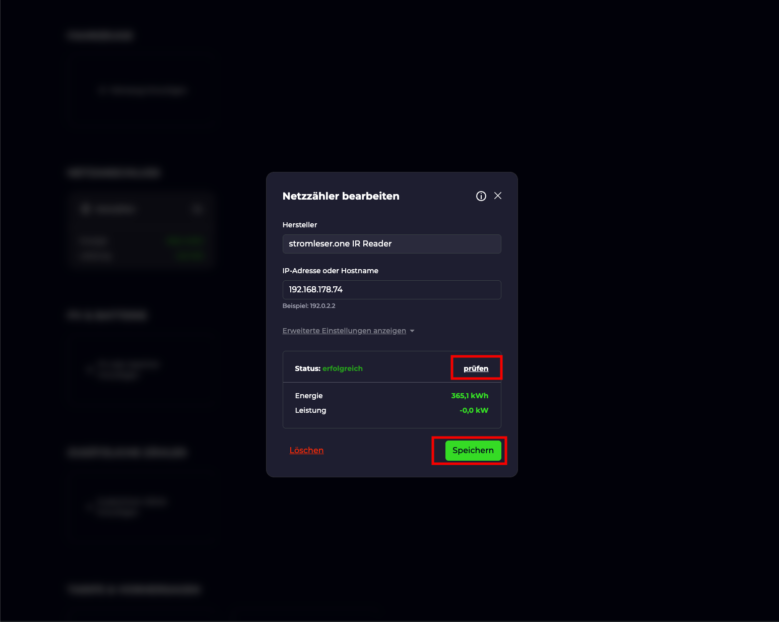 Trage im Feld IP-Adresse oder Hostname die lokale IP-Adresse deines stromleser.one ein (z. B. 192.168.178.74).